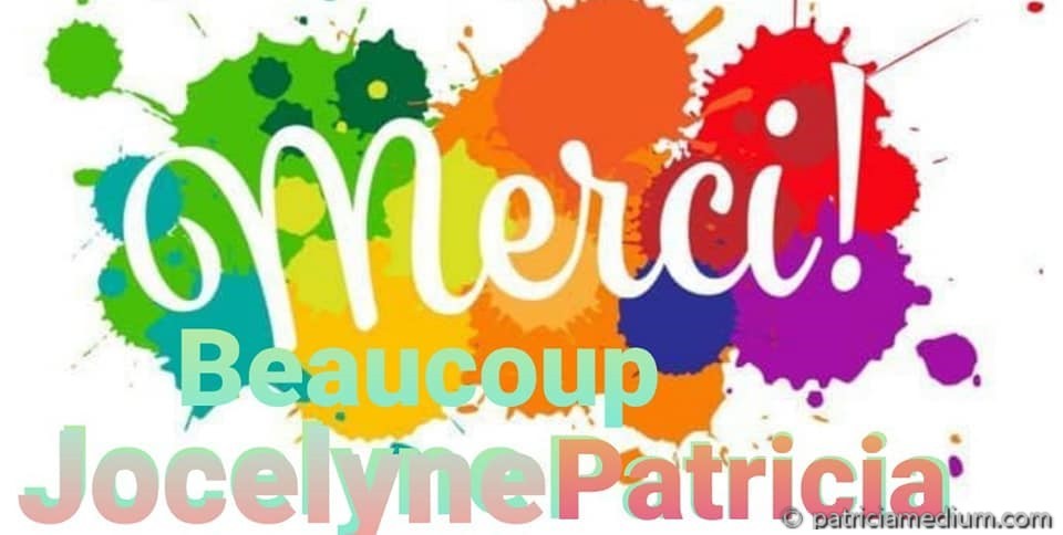 je tiens a remercier Patricia pour son aide son soutiens qui pour moi est très précieux, les choses qu'elles annoncent sont d'une justesse, toujours la pour nous donner des conseils pour nous prévenir des choses vont nous arriver.